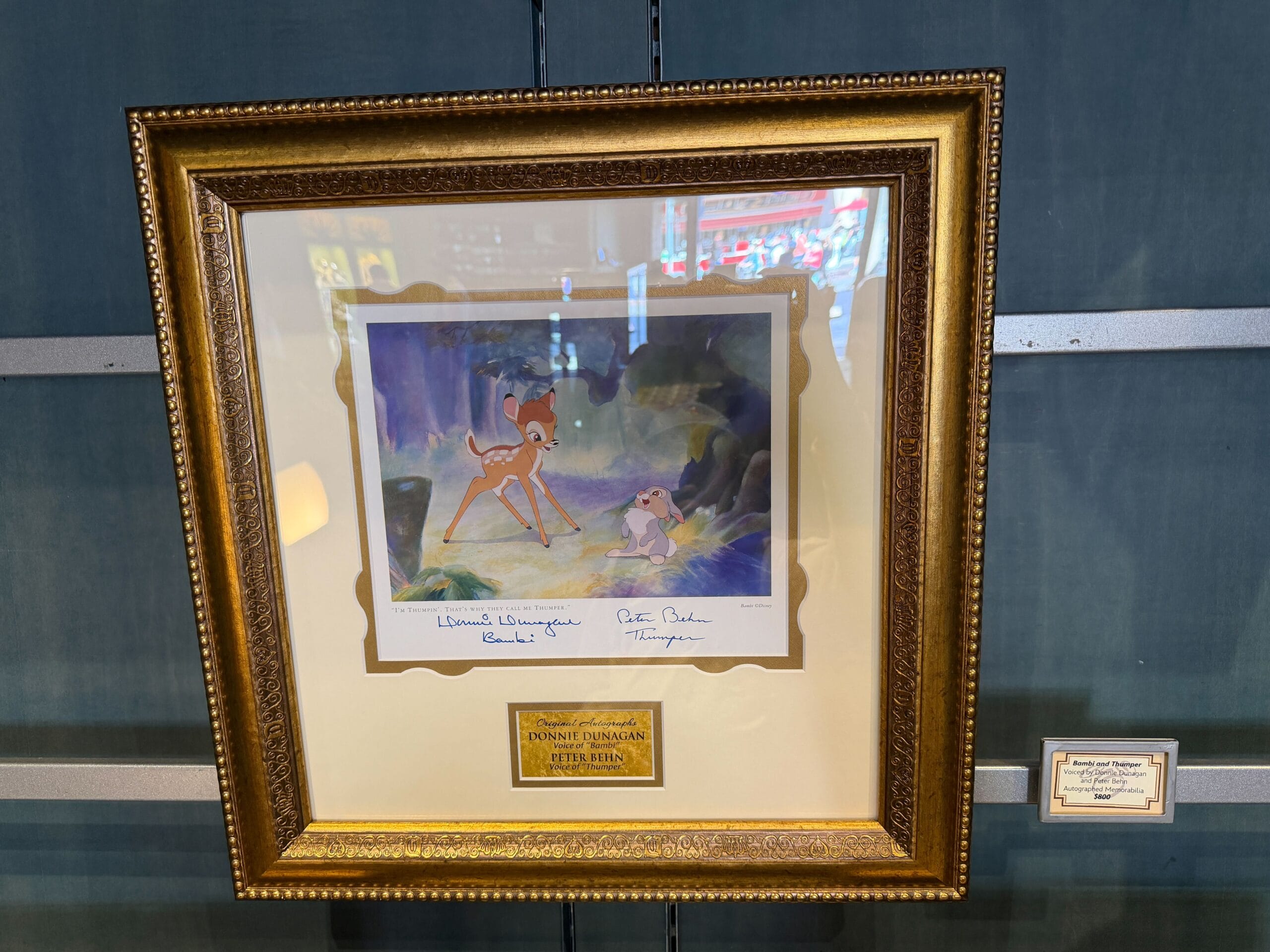 Artwork from Disney animated films signed by voice actors is available for purchase from Off the Page at Disney California Adventure. Each piece comes framed with a matte and golden plaque stating the name of the signer. Bambi and Thumper Art Signed by Voice Actors – $800 This artwork of Bambi and Thumper is signed the characters’ original voice actors, Donnie Dunagan (Bambi) and Peter Behn (Thumper). Dunagan was one of four Bambi actors, providing the voice of young Bambi for the majority of the film....