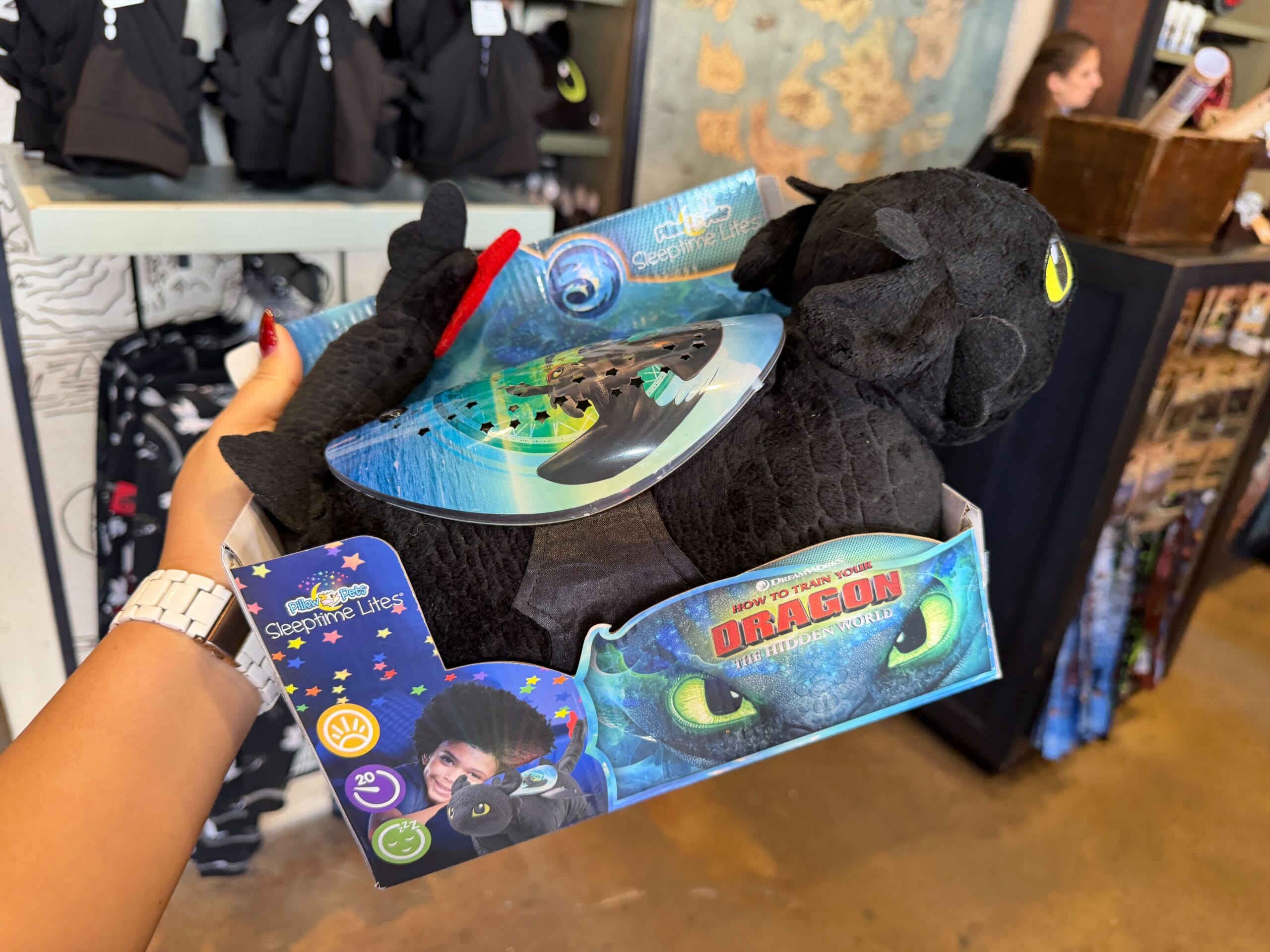 A new combination night light and pillow pet, Toothless is now available at Universal Orlando Resort. We found this item at Islands of Adventure. Toothless Sleeptime Lite – $40 The Toothless Pillow Pet Sleeptime Lite is a plush pillow with colorful lights that will shine on a room’s ceiling or wall. It has three modes and can be set to turn off with a 20 minute sleep timer....