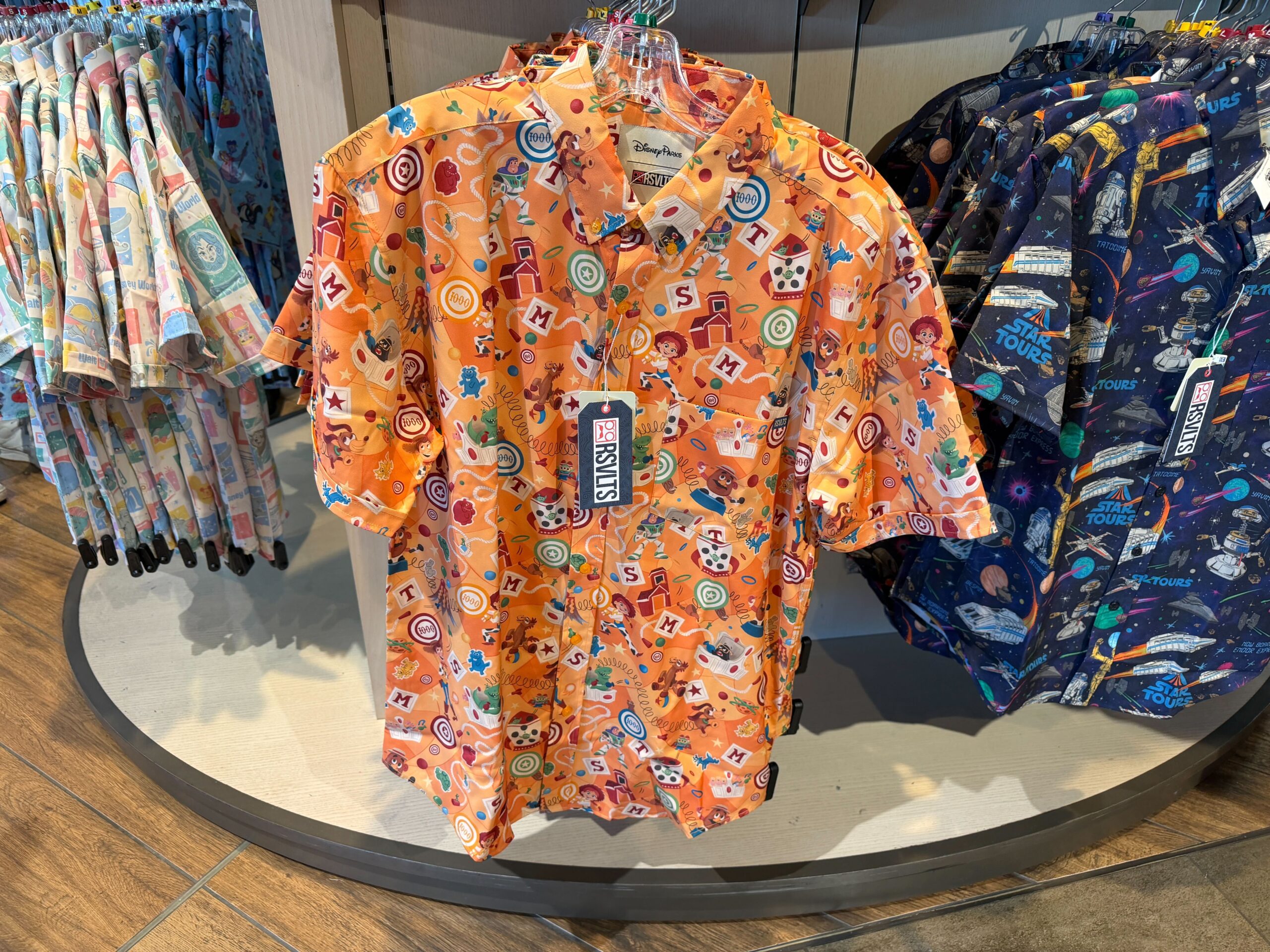RSVLTS and Disney have released a new series of short-sleeved button-ups inspired by Walt Disney World attractions and icons. We found these at World of Disney in Disney Springs. Walt Disney World RSVLTS ShirtsToy Story Mania Button-Up Shirt by RSVLTS – $80Walt Disney World Icons Button-Up Shirt by RSVLTS – $80Figment Button-Up Shirt by RSVLTS – $80Star Tours Button-Up Shirt by RSVLTS – $80 Toy Story Mania Button-Up Shirt by RSVLTS – $80 This orange-sleeved shirt is patterned with Toy Story Mania icons and characters. There are targets in different colors, ride vehicles, and toys....