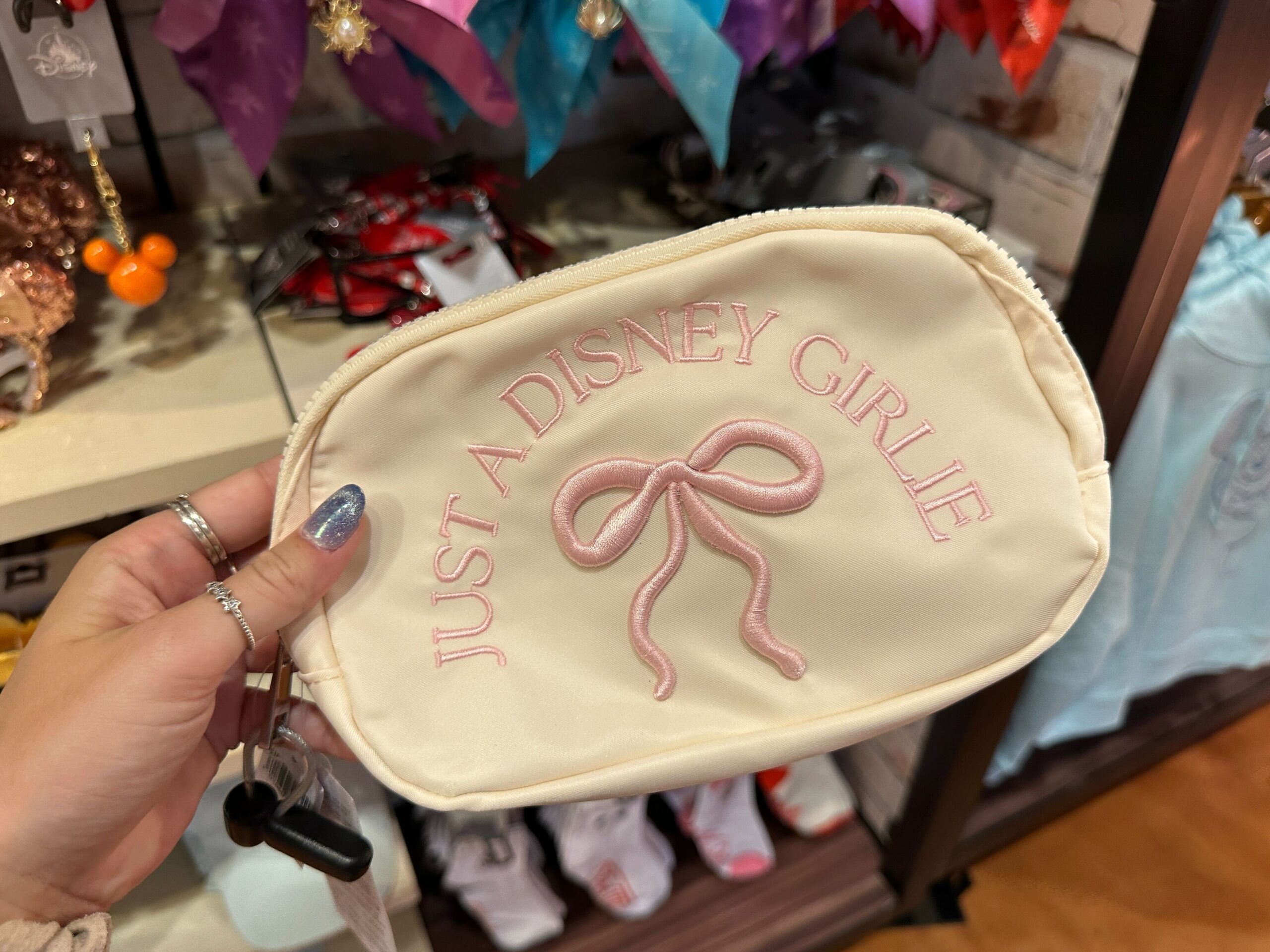 Are you just a Disney girl? Let the world know it with this new belt bag, the latest addition to the Disney Parks pink bow merchandise collection. ‘Just a Disney Girlie’ Belt Bag – $34. 99 The belt bag is made of cream-colored nylon....