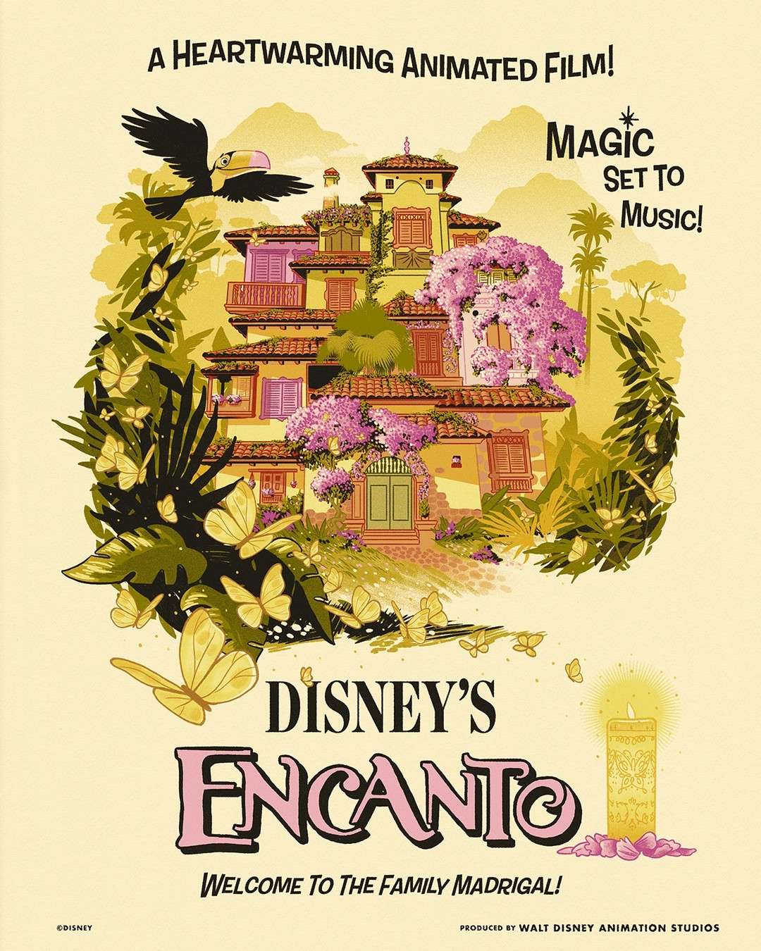 Walt Disney Animation shared retro-style posters for modern classics Tangled and Encanto. The artwork by Timba Smits is inspired by posters for old Disney films like Snow White and the Seven Dwarfs and Cinderella. Encanto Retro Poster Encanto is a “Heartwarming Animated Film,” according to the poster, which features Casita in muted colors with yellow butterflies and Pico the toucan. The Madrigal family’s magic candle is next to the film’s name....