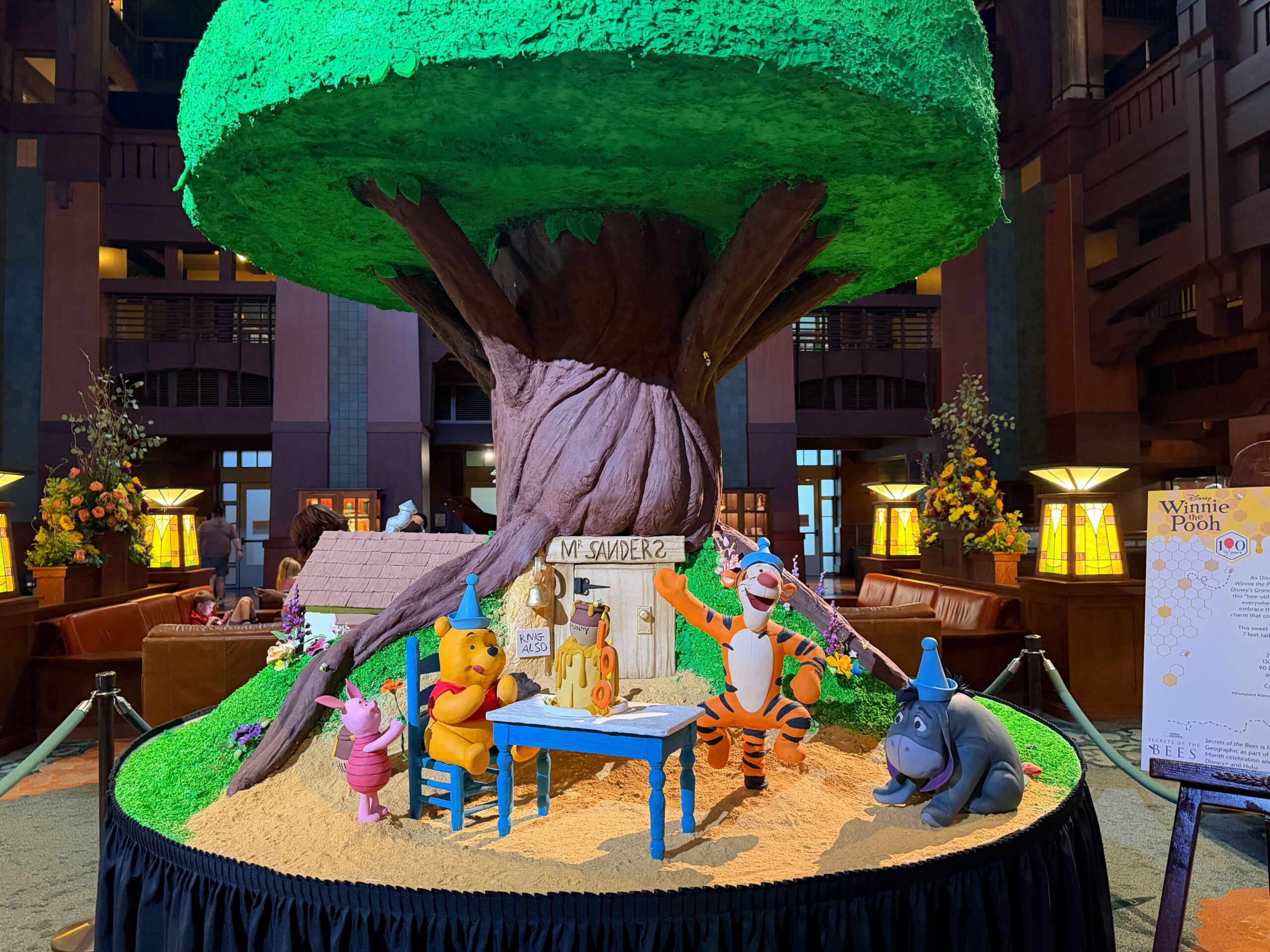 Visit the lobby of Disney’s Grand Californian Hotel to see a large chocolate and fondant sculpture honoring 100 years of Winnie the Pooh and National Geographic’s Secrets of the Bees. Winnie the Pooh Confectionery Sculpture The sculpture is based on the party scene in The Many Adventures of Winnie the Pooh (1977). In the center is Pooh Bear’s tree house with “Mr. Sanders” above the door....