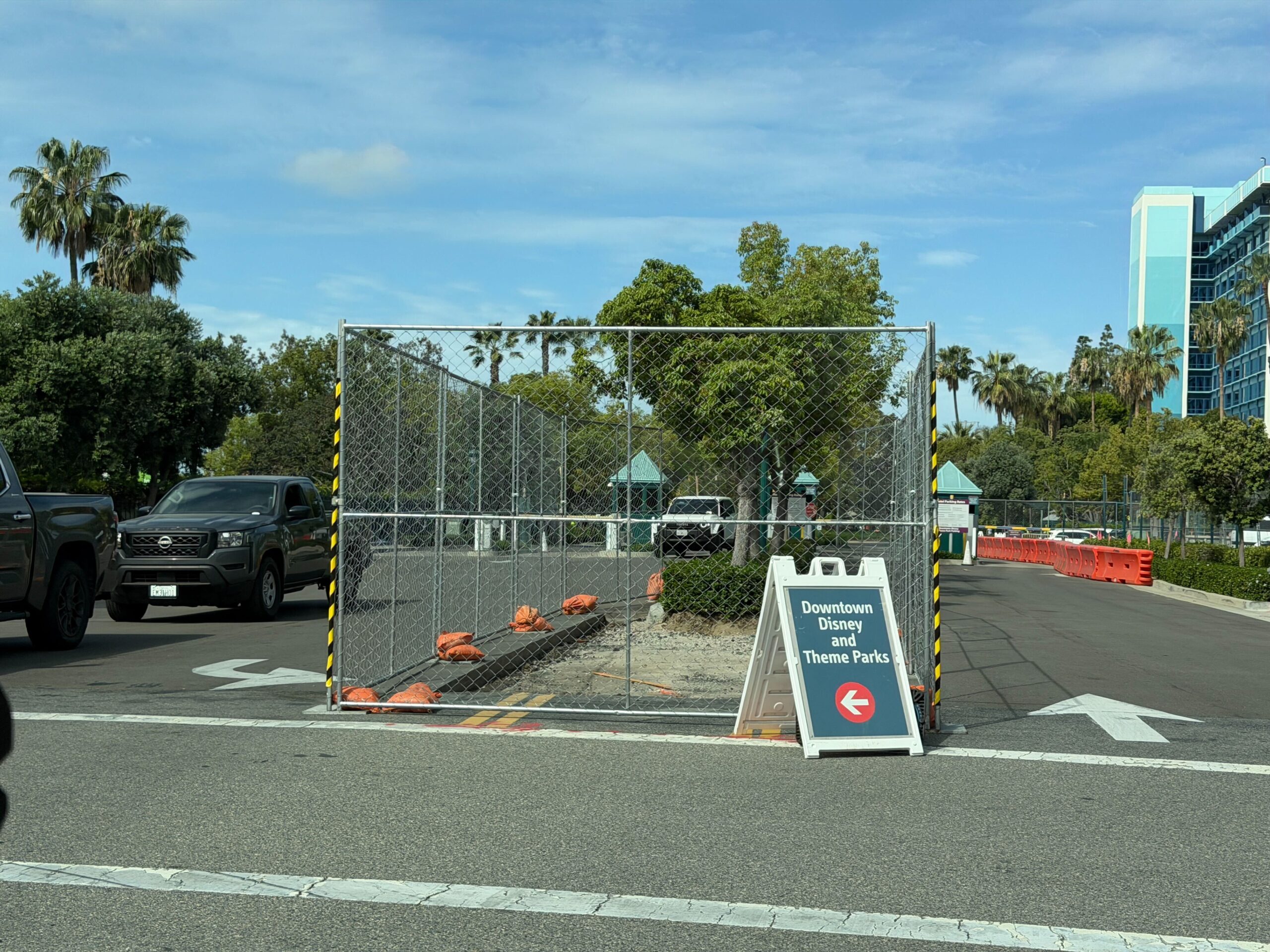 Crews have torn up pavement and flower beds for refurbishment around the Disneyland Hotel parking lot. Disneyland Hotel Parking Lot Construction Part of the median flower bed at the roadway entrance to the resort has been demolished. The dirt left behind is surrounded by a tall fence. The entrance and exit remain open....