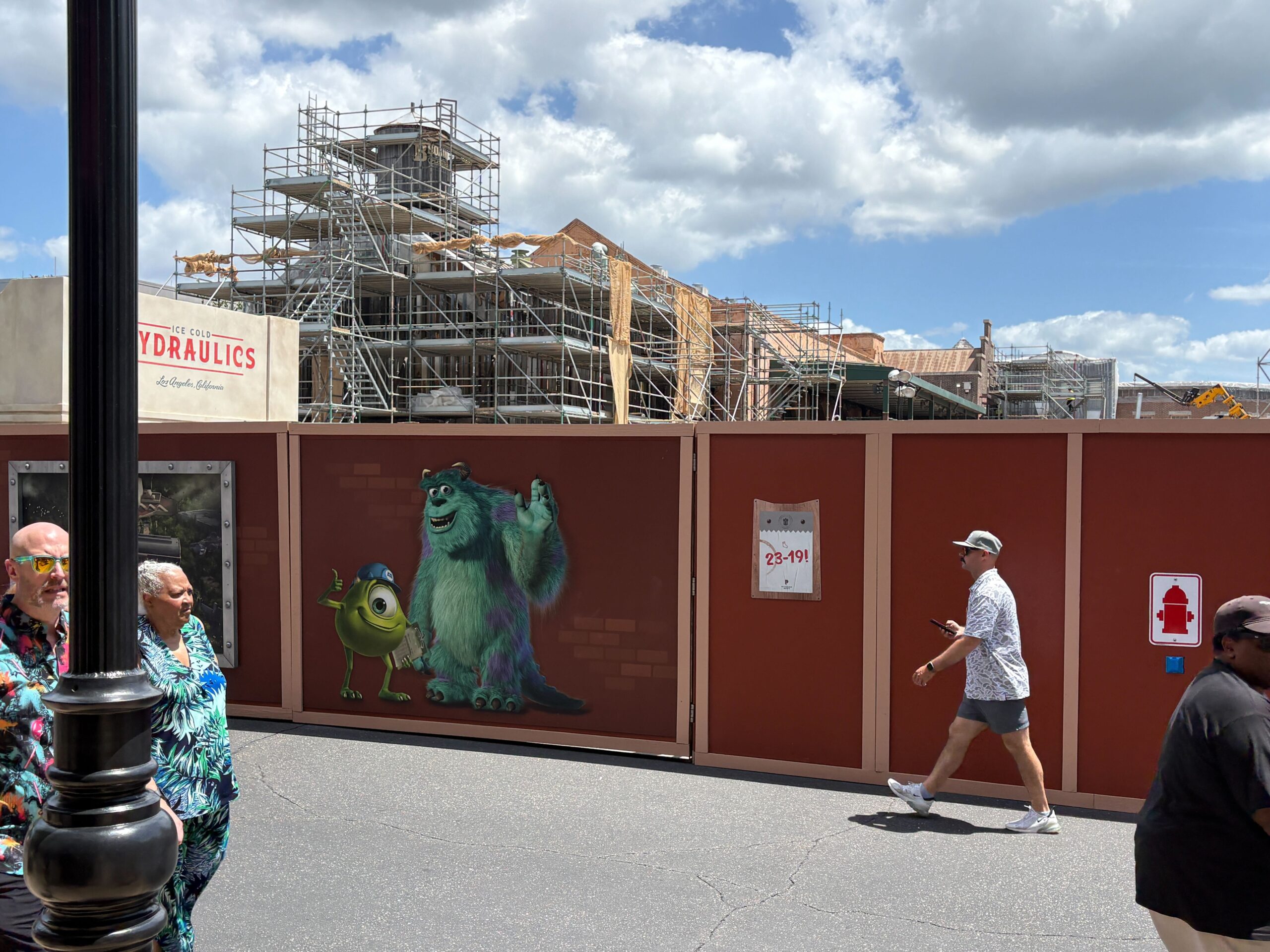 Construction continues to progress at Disney’s Hollywood Studios to retheme Muppets Courtyard into Monstropolis. Muppets Courtyard Entrance Pillar Removed During our April 14 visit to Disney’s Hollywood Studios to check on the Monstropolis construction progress, we noticed another entrance pillar was removed. For reference, this is what the entrance pillar looked like yesterday (located on the far left side of the photo): The stripped column was visible above the image of Sulley on the construction walls. The matching pillar and brick wall on the right side of the entrance were removed back in March....