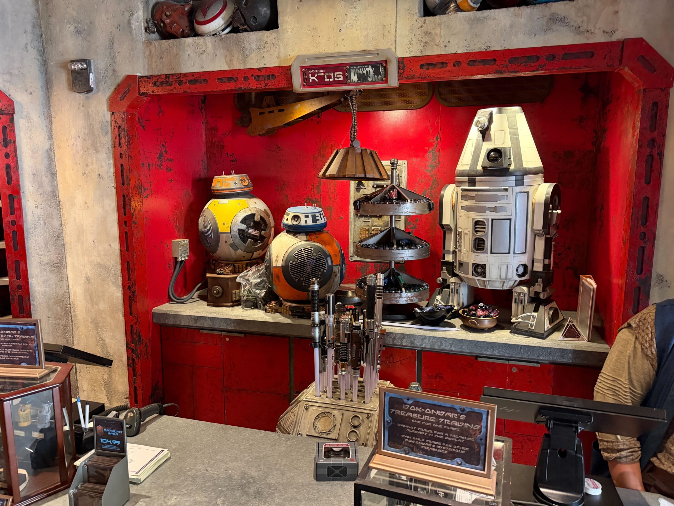 The back of Droid Depot in Star Wars: Galaxy’s Edge at Disneyland has been temporarily taken over by merchandise from Dok-Ondar’s Den of Antiquities. The other shop is currently closed for changes related to the land’s timeline shift. Dok-Ondar’s Artifacts in Droid Depot Dok-Ondar’s Treasure Trading is available at the check-out counter. A variety of lightsabers are behind the counter and on the shelves....