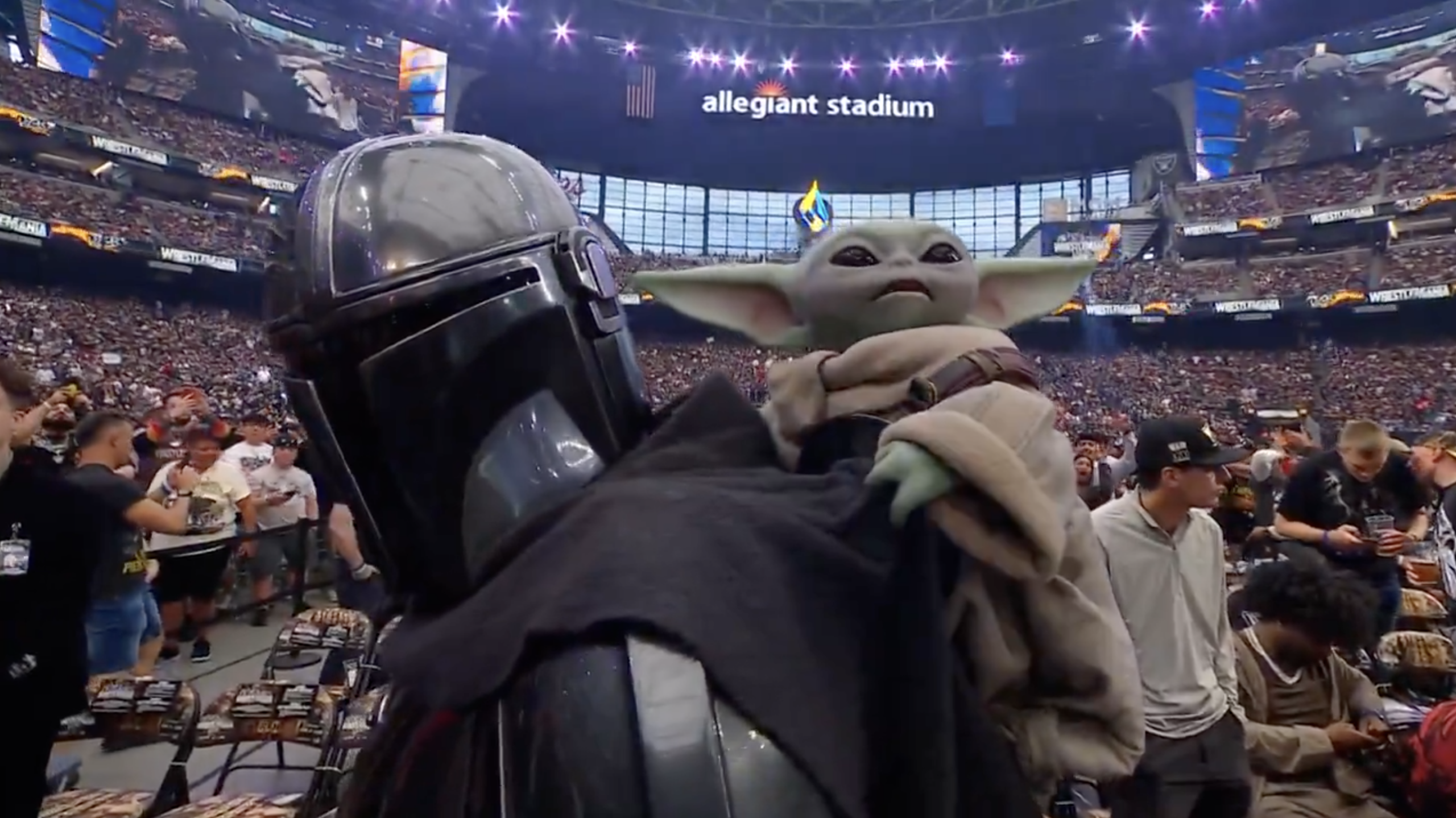 The Mandalorian and Grogu appeared in-person at WrestleMania 42 to advertise their upcoming movie. The Mandalorian and Grogu at WrestleMania WWE and Star Wars both shared clips of the pair at Allegiant Stadium in Paradise, Nevada. They only appeared on TV briefly Saturday night to introduce an exclusive look at Star Wars: The Mandalorian and Grogu. The Mandalorian and Grogu Coming to theaters May 22!...