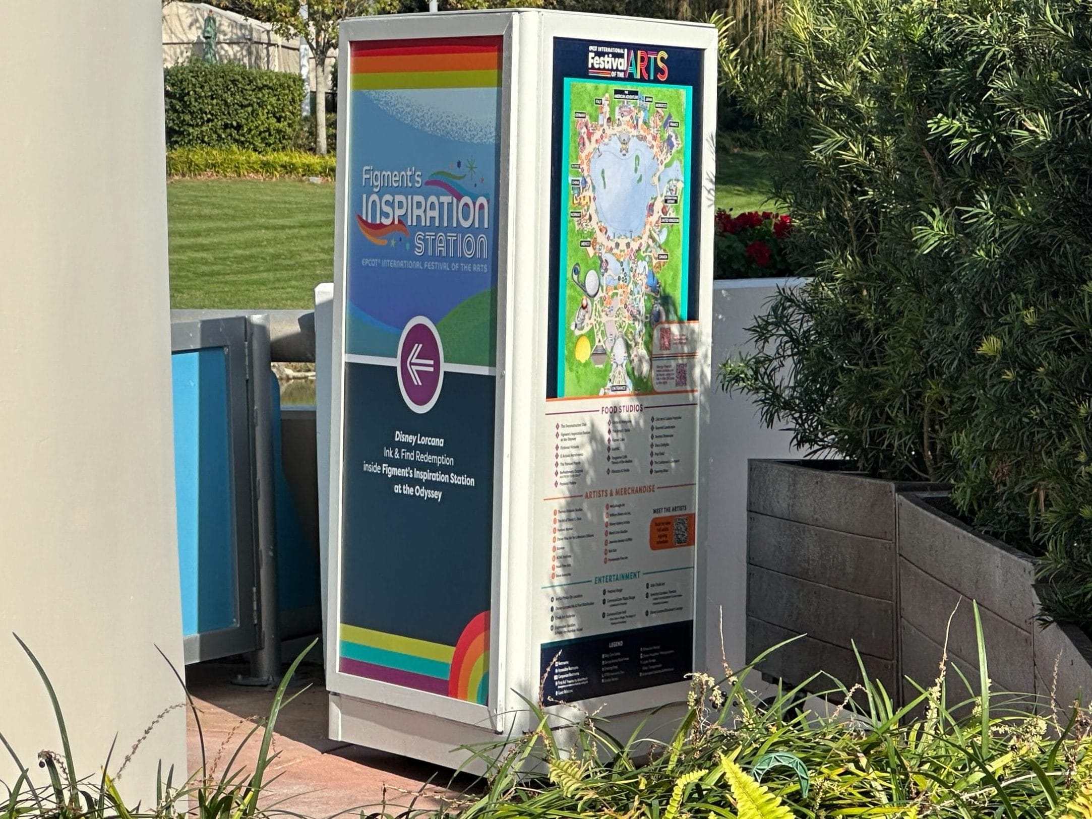 On Tuesday, January 13, we spotted the official EPCOT International Festival of the Arts partially hidden behind rolling planters. Festival of the Arts Map This map is on a column that will eventually point to Figment’s Inspiration Station. Unlike a standard EPCOT map, this highlights festival-specific offerings like food studios, artists, merchandise locations, and entertainment. The 2026 EPCOT International Festival of the Arts begins on Friday, January 16....
