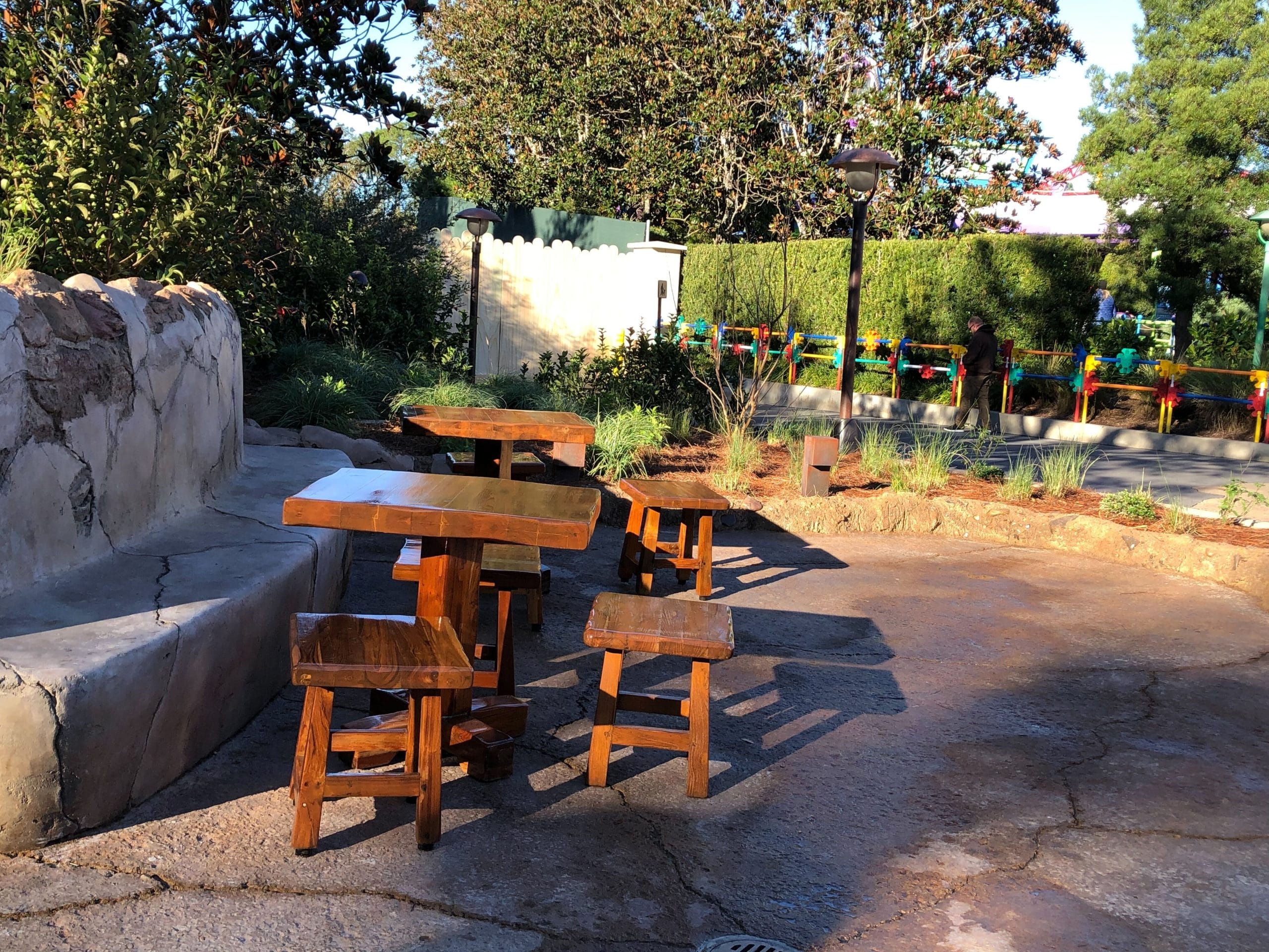 Stone built-in benches and tables are now open to guests in the area between Star Wars: Galaxy’s Edge and Toy Story Land at Hollywood Studios. New Seating Area Part of the area has stone bench seating with two wooden tables and six wooden stools. The stone bench is connected to a new planter and a taller built-in stone table for stand-up snacking. The area closest to the entrance of Star Wars: Galaxy’s Edge has another stand-up dining area, a single wooden table, this one with four wooden stools, and a longer stone seating area....