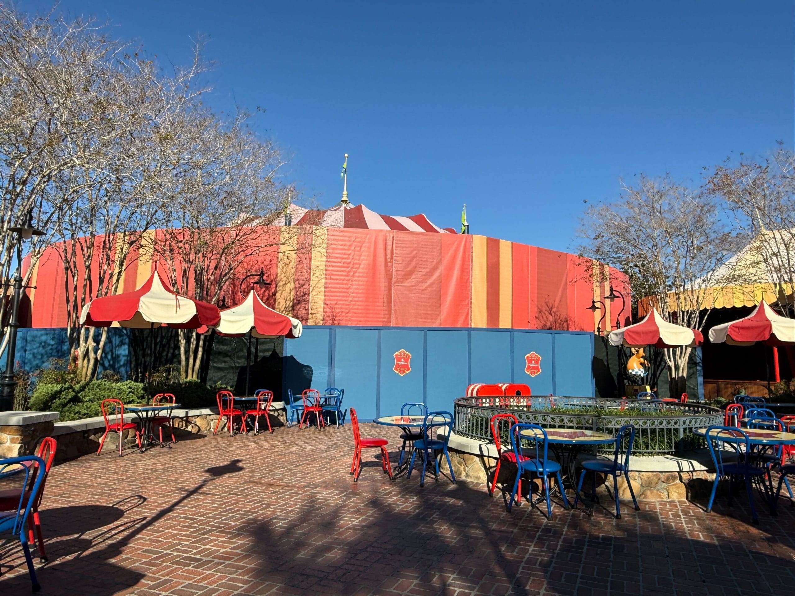 As we correctly predicted in our last construction update for Pete’s Silly Sideshow, a themed scrim has arrived at the tent. The meet-and-greet venue is closed for refurbishment for the foreseeable future, so a themed scrim helps improve the view slightly for guests. Pete’s Silly Sideshow Refurbishment While the bottom half of the tent are the standard Disney construction walls, the top are a light and dark red with yellow stripes scrim, slightly reminiscent of the circus tent behind it. The scrim runs across the entire guest-facing area of the construction....