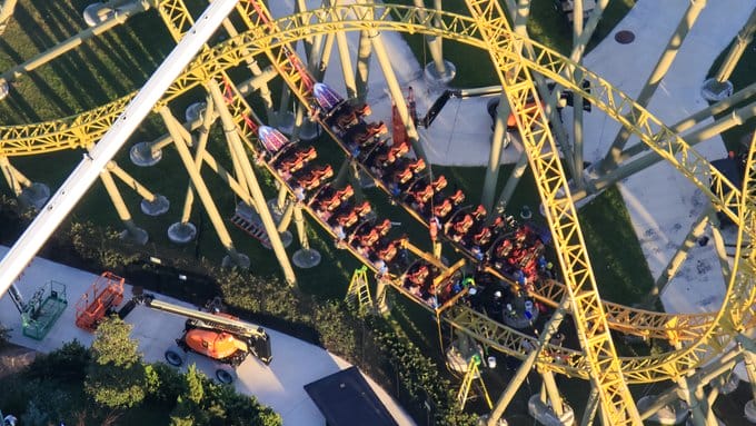 Aerial photographer bioreconstruct has shared some photos of how Epic Universe has to recover Stardust Racers trains stuck on the track: with a crane. Stardust Racers Trains Stuck in Valley Gusty winds blew through the Orlando area yesterday, January 18, and Stardust Racers was hit with enough force that both trains became stuck in a valley after the second launch spot. Fortunately, the trains were both empty; team members were testing the trains without guests in hopes of reopening after weather shut it down. X user ElToroRyan caught video of the incident from the Hiccup’s Wing Gliders queue: Both sides of Stardust Racers just valleyed....
